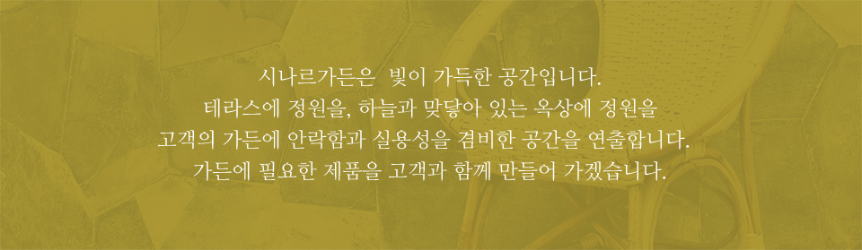 시나를 가든은 주택. 호텔, 리조트. 팬션 .레스토랑 카페 상가 실내와 가든테라스에 에 필요한 제품을 직접 생산, 판매 합니다.
